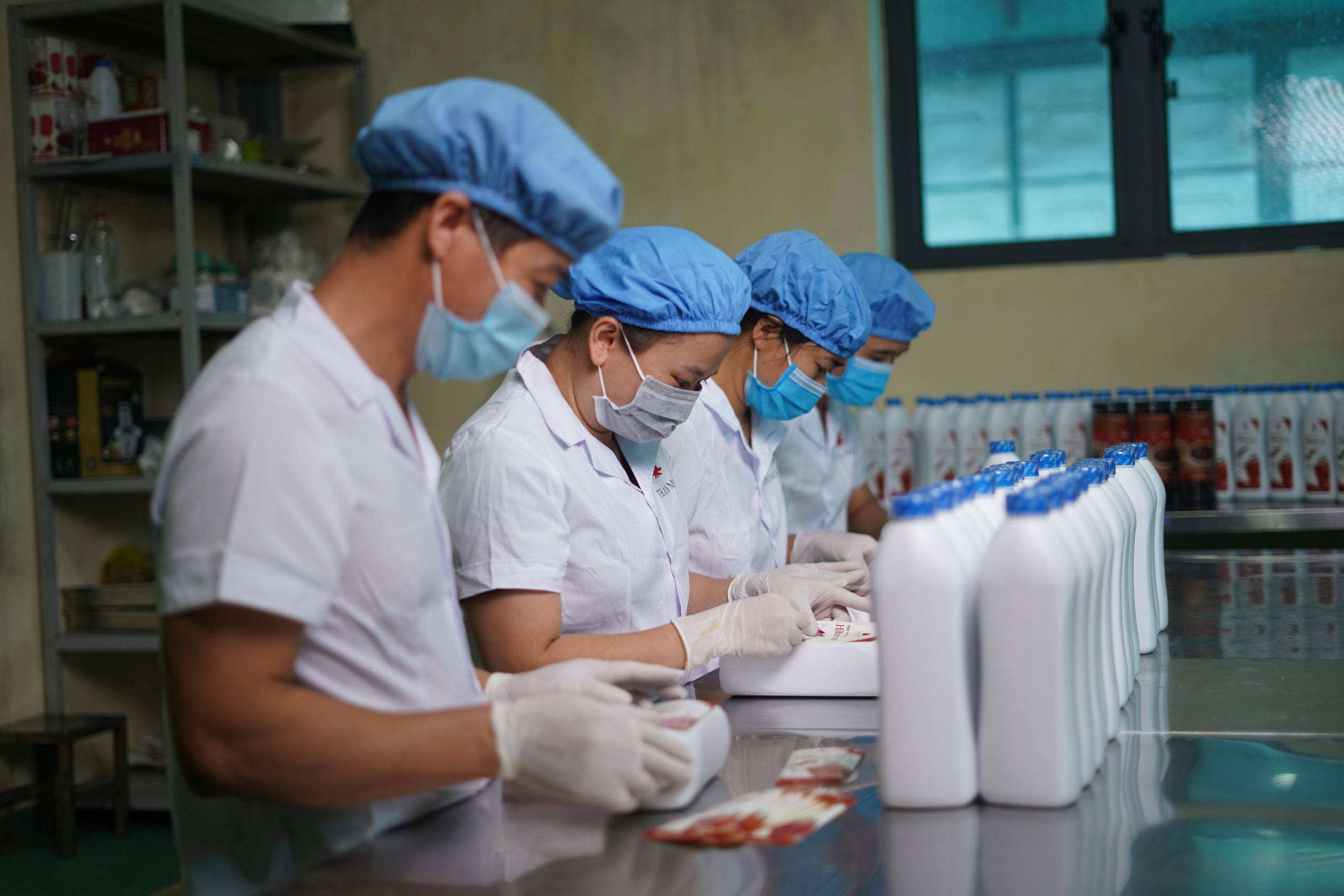 Công đoạn dán nhãn chai nước cốt quả Hibiscus